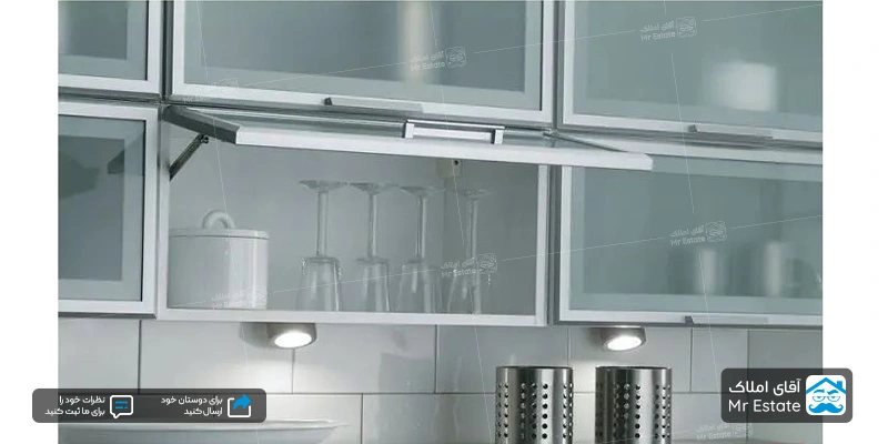 این یک نوع طراحی کابینت آشپزخانه است که در آن به جای چوب از آلومینیوم استفاده می شود. شیشههای مهآلود در مرکز که توسط ورقهای آلومینیومی ضخیم پشتیبانی میشوند، دارای دستگیره های حالت فشار و کششی در زیر هستند. شما می توانید هر چیزی را در این کابینت ها ذخیره کنید، از ظروف شیشه ای تا مواد غذایی. از آنجایی که شیشه کمی مه آلود است، فقط شما می دانید داخل کابینت چیست و هیچ کس دیگری نمی تواند داخل کابینت شما را ببیند.