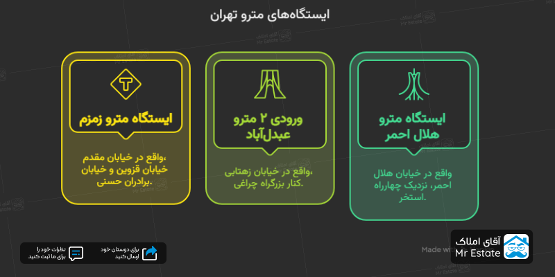 - ایستگاه مترو هلال احمر (واقع در خیابان هلال احمر، نرسیده به چهارراه استخر، نبش کوچه سرزعیم)