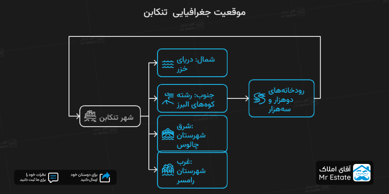 این شهر از سمت شمال به دریای خزر، از سمت جنوب به رشته کوههای البرز، از سمت شرق به شهرستان چالوس و از سمت غرب به شهرستان رامسر محدود میشود. این موقعیت جغرافیایی خاص باعث شده تا تنکابن دارای مناظر طبیعی فوقالعادهای باشد. همچنین، رودخانههای پرآبی همچون رودخانه دوهزار و سههزار از کوههای البرز سرچشمه میگیرند و از میان این شهر عبور میکنند، که زیبایی آن را دوچندان کرده است.