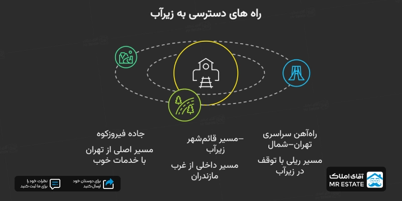 | دسترسی ریلی | ایستگاه راهآهن زیرآب (قطار تهران - ساری) |